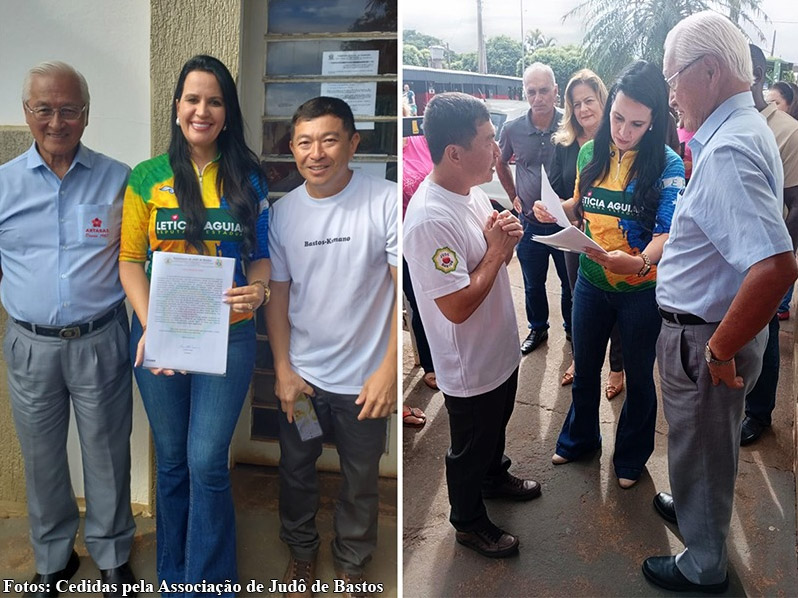 O presidente, Ernesto Osawa, e o conselheiro fiscal, Edison Yoshikawa, solicitaram a deputada estadual Letícia Aguiar recursos financeiros para a realização de melhorias estruturais no Centro de Treinamento da Associação de Judô de Bastos. O pedido de apoio para as obras foi entregue pessoalmente pelos diretores Associação de Judô de Bastos durante visita da parlamentar estadual a cidade de Salmourão (SP) no dia 12 de fevereiro, último.
